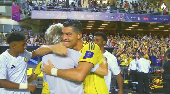 开云体育-终场时刻C罗与主帅相拥庆祝,全场观众高举手机捕捉经典瞬间